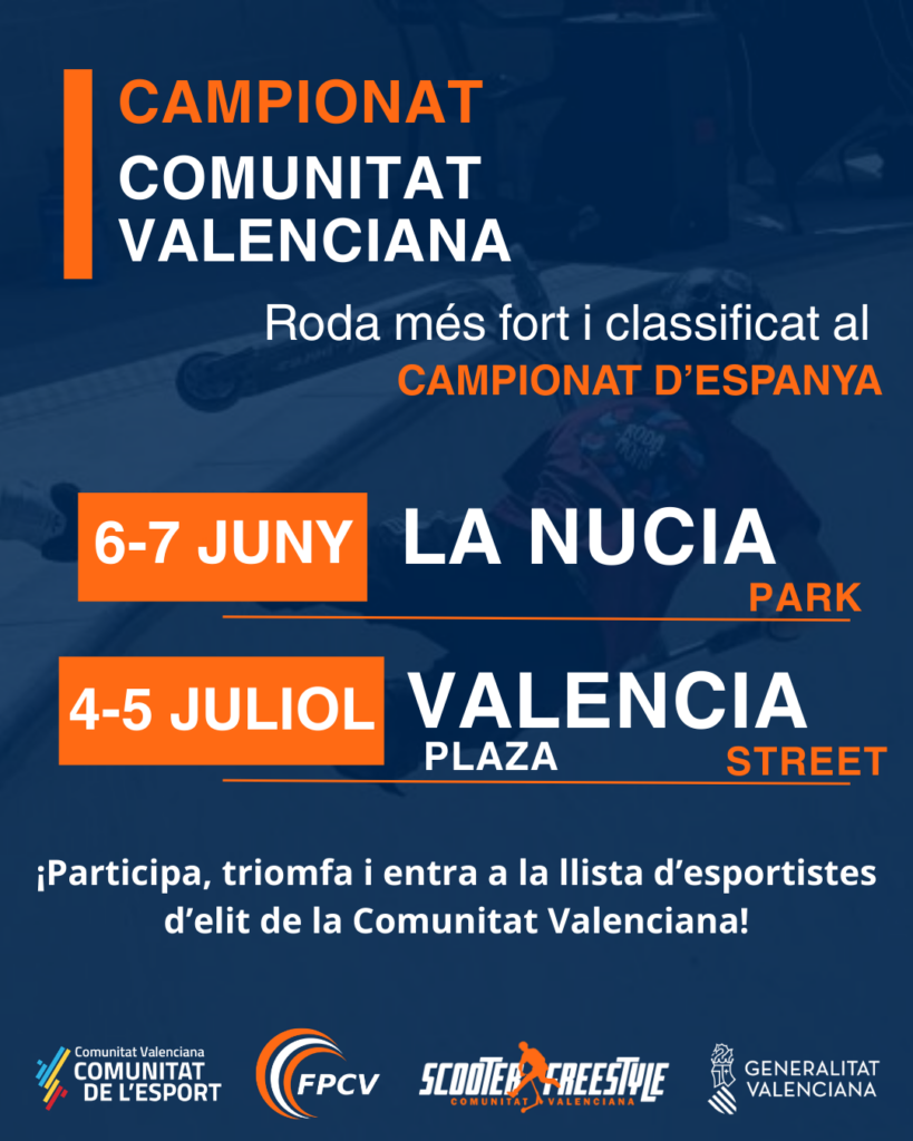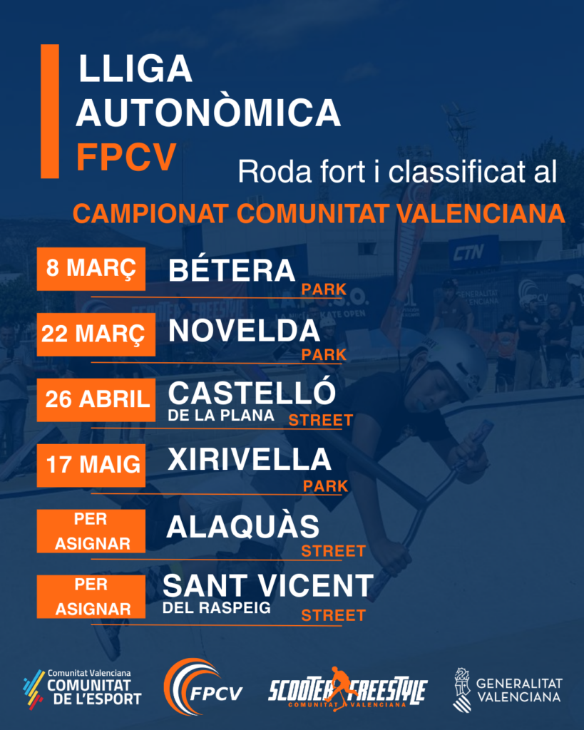 La Federació de Patinatge de la Comunitat Valenciana ha emés un comunicat oficial informant del calendari oficial de competicions de Scooter Freestyle per a la temporada 2026, amb la celebració de la Lliga Autonòmica i el Campionat de la Comunitat Valenciana en les seues modalitats Street i Park.