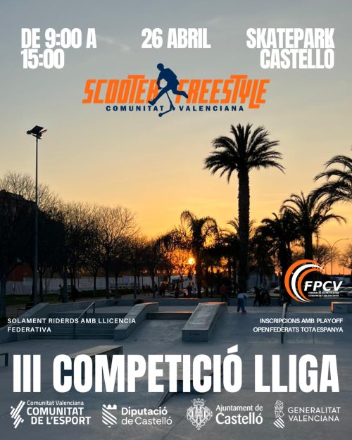 La competició tindrà lloc el pròxim 26 d’abril al Skatepark de Castelló, en horari de 9:00 a 15:00 hores. Es preveu una jornada que reunirà riders de tota la Comunitat Valenciana i també d’altres territoris, en una prova oberta a participants federats de tot Espanya.